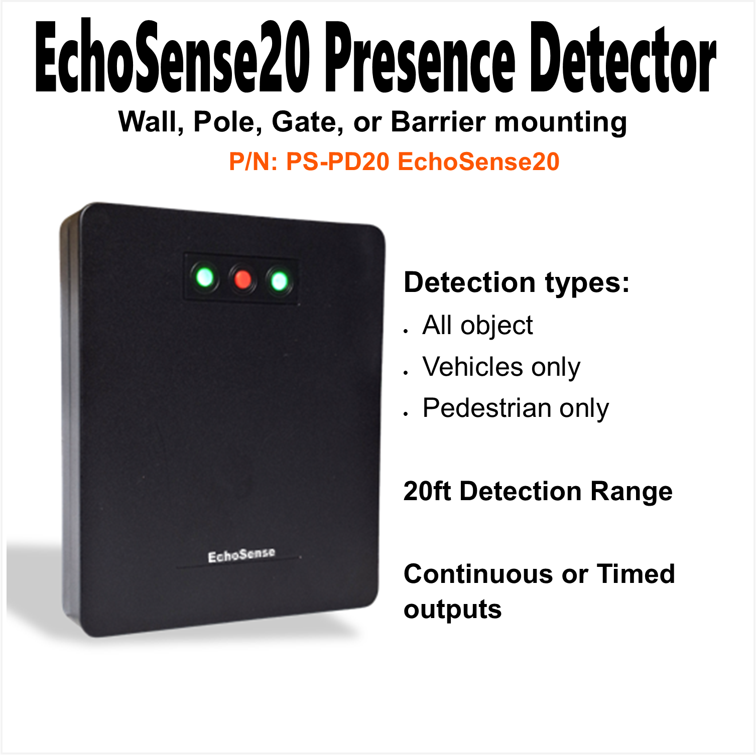 The PS-PD20 EchoSense20 is a compact, radar-based presence detector engineered for safety and activation purposes. It can be configured to detect vehicles only, pedestrians only, or both, with precise control over detection range, sensitivity, and output timing. Ideal for integration with gates, doors, warning signs, and access control systems, the EchoSense20 provides reliable detection.